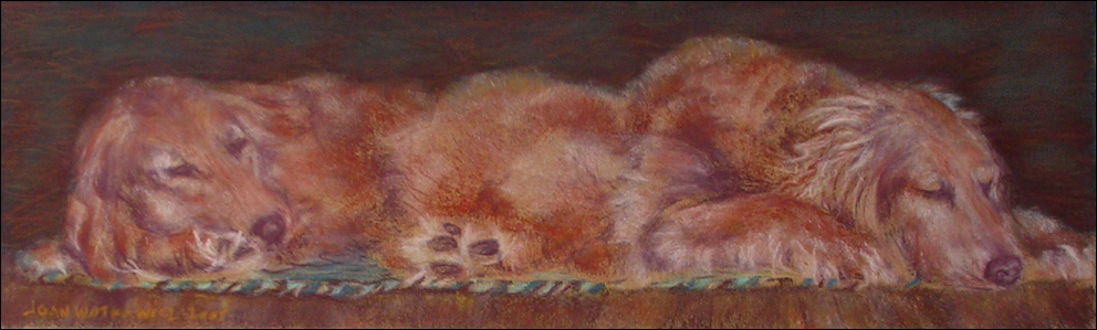 My two golden retriever siblings, in their usual position.Sometimes it's difficult to know where one ends and the other begins.