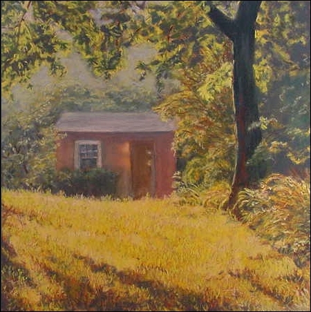Morning sun in my neighbor's yard after days of rain. Maff is gone now, but his old shed still stands.